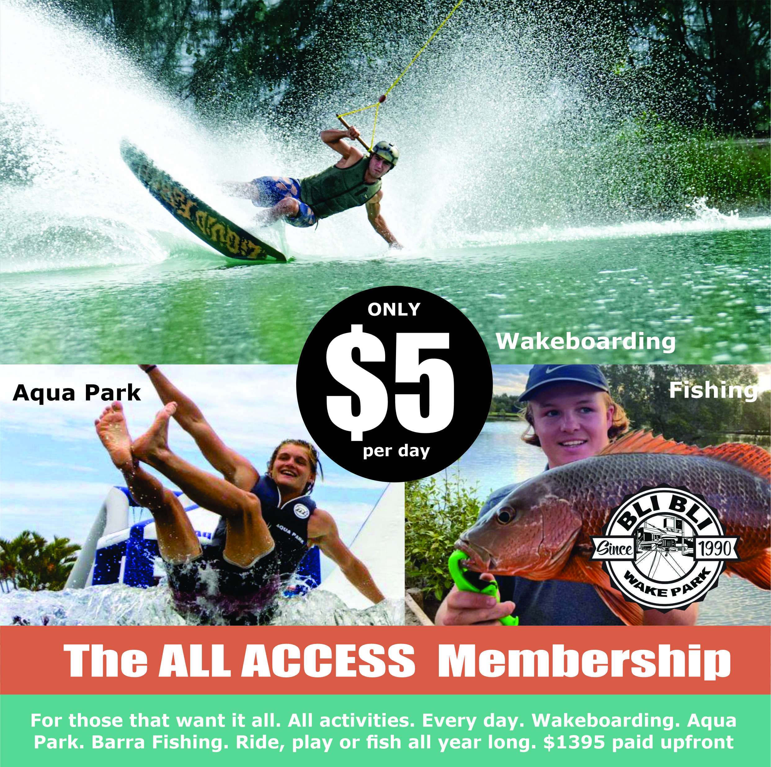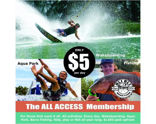 The 2022 Paid In Advance Ultimate All Access Bli Bli Watersports Membership gives you access to wakeboarding, Aqua Park and Barra Fishing all year long! Subject to seasonal opening times, bookings and capacity limits this membership allows you to ride, play or fish whenever you want all year round. Price is per person adults or kids alike. Valid for 12 months from date of purchase.